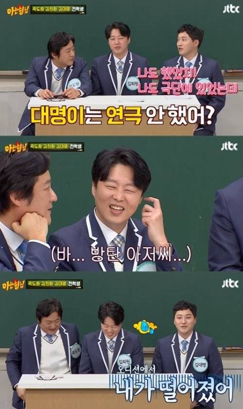 김대명은 뮤지컬 '빨래' 오디션 비하인드 스토리를 공개했다. 그는 "오디션장에 '방탄 아저씨'가 있었다. 알고 보니 김희원이 극단 대표였다. 당시 오디션에서 탈락했는데, 그다음 오디션에서 다시 만났는데 또 떨어졌다"고 밝혔다.