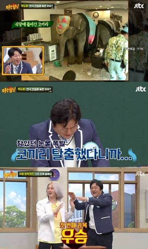 그는 "한 명이 늦으면 팀원 전체가 공연 연습을 못 하게 되는데 (코끼리 탈출로) 도로가 아수라장이 되어 연습에 늦었다. 사실대로 말했는데 제일 착한 형이 화를 내더라. 연습 후 회식자리에서 뉴스에 '코끼리 탈출 사건'이 보도돼 진짜임이 알려졌다. 갑자기 서러워져서 '코끼리 탈출했다니까' 하면서 울었다"고 말해 모두를 폭소케 했다.