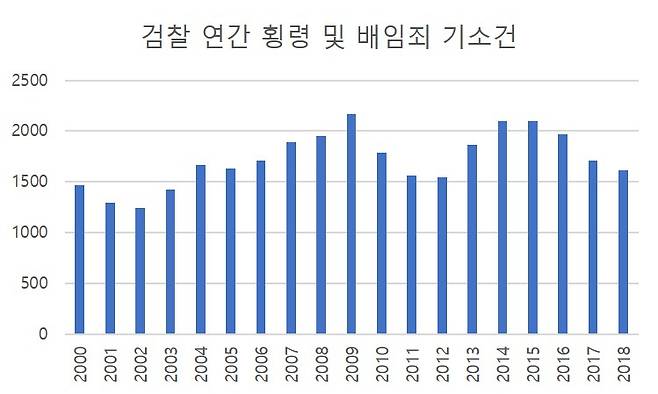 23일 검찰에 따르면 지난해 기소된 횡령 및 배임(업무상 횡령·배임 포함) 사건의 기소 건은 총 4143건으로, 지난 5년 평균 기소 건수인 4398건보다 소폭 감소했다. 대법원과 형사정책연구원에서 제공하는 ‘범죄와 형사사법 통계정보’에 따르면 2018년 1심에서 횡령·배임 혐의로 선고한 사건은 총 5267건이었고, 무죄율은 5.8%(306건)에 달했다. 특경가법상 횡령·배임 혐의는 11.42%를 차지했다. 반면 같은 기간 전체 무죄율은 0.79%에 그쳤다.