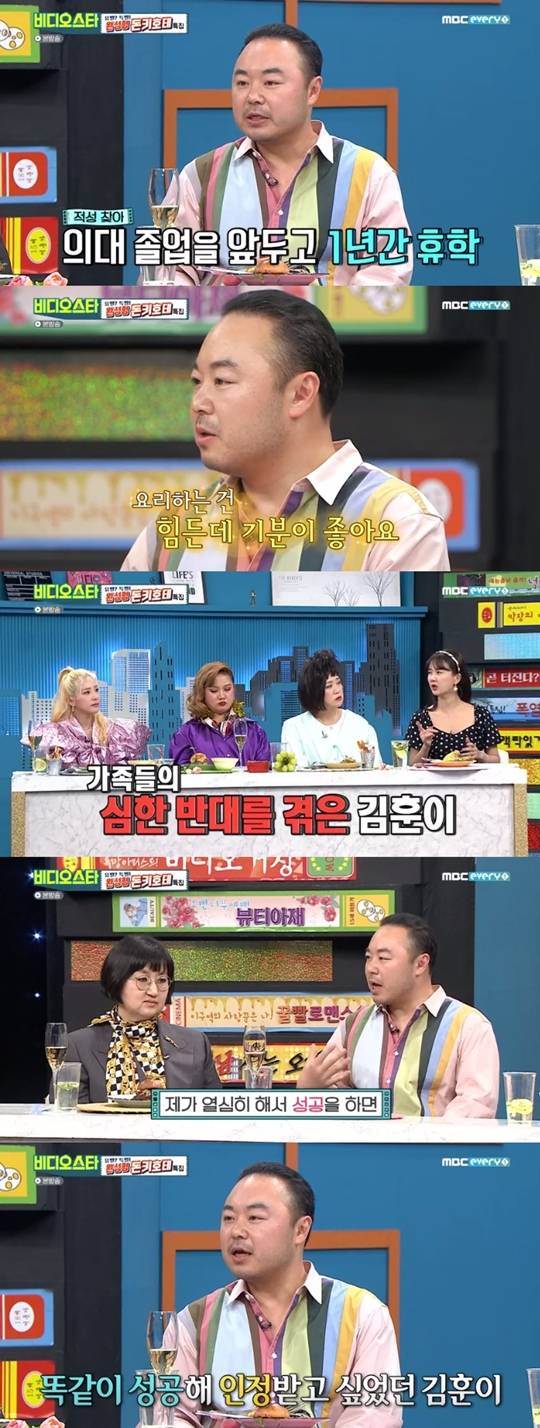 이날 김훈이는 "의대 졸업 1년 앞두고 셰프에 도전했다"라고 밝혀 모두를 놀라게 했다. 이어 "병원에서 일하면서 너무 몸이 아팠다. 그래서 1년을 휴학했다. 그때 시간이 많으니까 요리를 배우고 인턴을 했다. 병원에서 그렇게 열심히 했는데 너무 싫었다. 그런데 식당에서는 더 힘든데 기분이 더 좋았다. 그래도 내가 좋아하는 일을 찾아서 다행이다. 요리사 길로 가야 되겠다 생각했다"라고 설명했다.