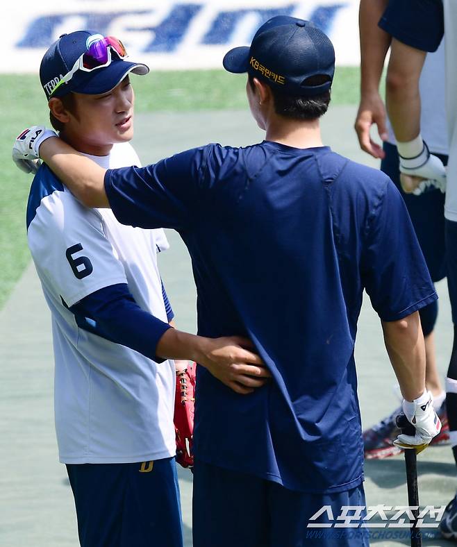 [포토] 김태진-정수빈 '무더위에도 다정한 손길교환'