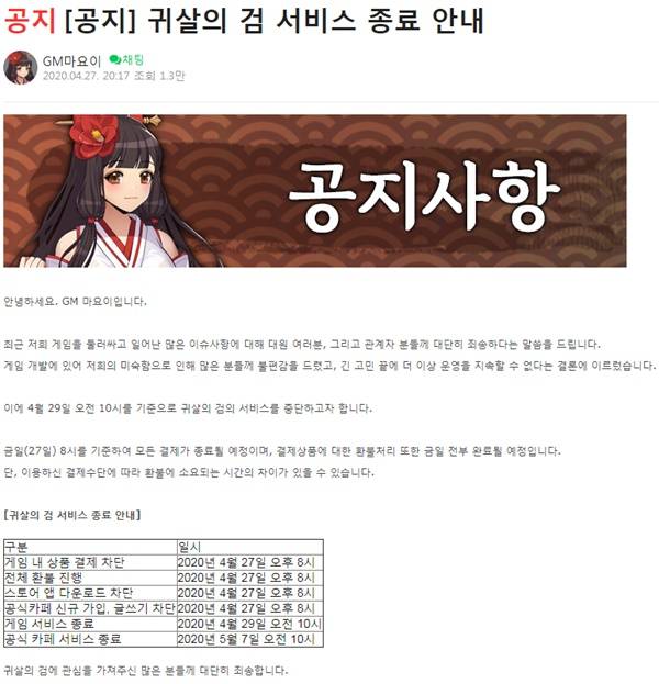 일본 인기 만화 '귀멸의 칼날'을 표절했다는 의혹에 휘말렸던 모바일게임 '귀살의검'이 결국 3일만에 서비스 종료를 결정했다.