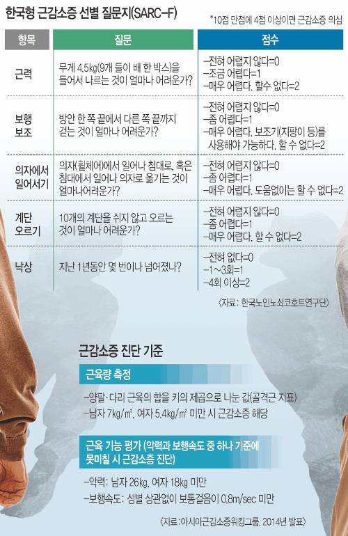 또 악력이 남자 26㎏, 여자 18㎏ 미만일 경우 감소됐다고 본다. 보행속도 감소는 보통 걸음(편안한 보행)으로 초당 0.8m 미만일 때 해당된다. 최근엔 이런 측정 없이 한국형 ‘근감소증 선별 질문지(SARC-F)’가 개발돼 해당 여부를 간단히 감별할 수 있게 됐다.