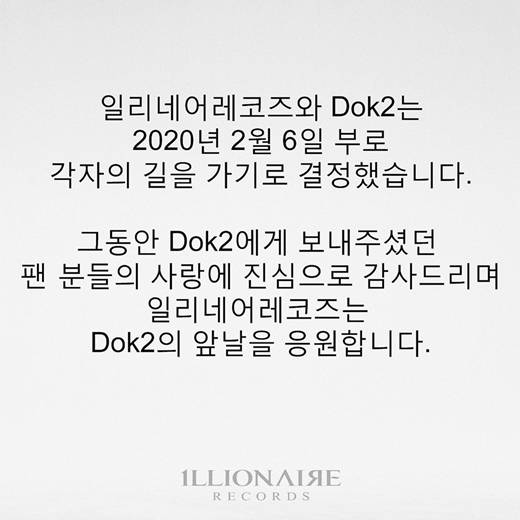 이어 "그동안 Dok2에게 보내주셨던 팬 분들의 사랑에 진심으로 감사드리며, 일리네어레코즈는 Dok2의 앞날을 응원한다"고 덧붙였다.