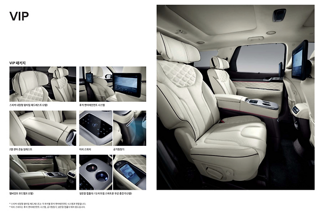 현대차는 특히 캘리그래피 트림을 기반으로 2열의 상품성을 극대화한 스페셜 모델 ‘VIP’도 선보였다. 팰리세이드 VIP는 2열에서 시청 가능한 모니터 2대로 구성된 ‘후석 엔터테인먼트 시스템(RSE)’을 비롯해 공기청정기와 냉ㆍ온장 컵홀더 등이 탑재된 2열 센터 콘솔 암레스트, 2열 스마트폰 무선충전기, 스피커 내장형 윙타입 헤드레스트 등으로 편의성을 강화했다.