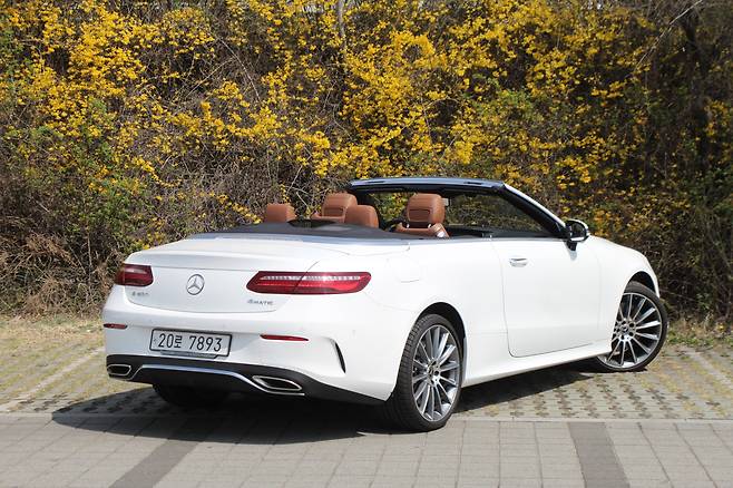 팽팽하게 당겨진 소프트탑은 윈도우와 함께 근육질의 후면부로 조화롭게 이어지며 우아하면서도 날렵하게 흐르는 라인을 완성하고, 길게 뻗은 감각적인 형태의 숄더 라인은 4인승 카브리올레 모델의 스포티한 외관 분위기를 연출한다. 또한, 소프트탑이 닫혀 있을 때에는 E클래스 쿠페와 유사한 실루엣으로 완벽한 비율을 자랑한다.