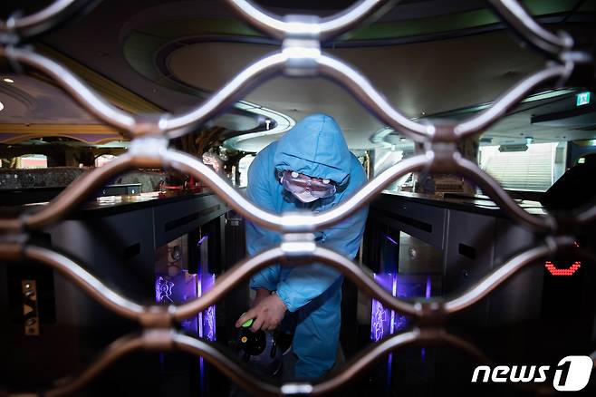 사진은 이날 오후 서울 송파구 롯데월드에서 관계자들이 방역을 하고 있다.