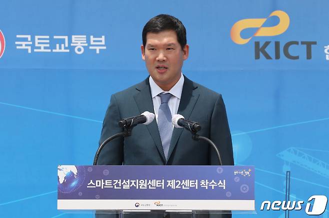 (고양=뉴스1) 송원영 기자 = 17일 경기 고양시 한국건설기술연구원에서 열린 스마트건설지원센터 제2센터 착수식에서 허윤홍 GS건설 신사업부문 사장이 축사를 하고 있다. 2020.6.17/뉴스1