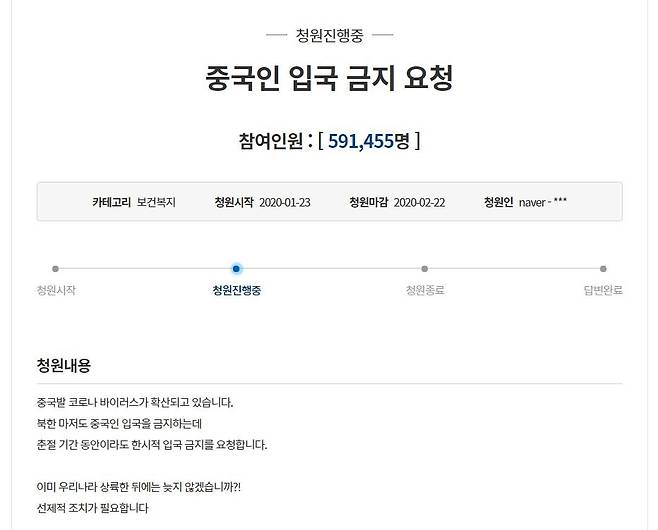 | ▲ 중국인 입국 금지 청와대 청원글 서명인이 59만명을 넘어섰다. |