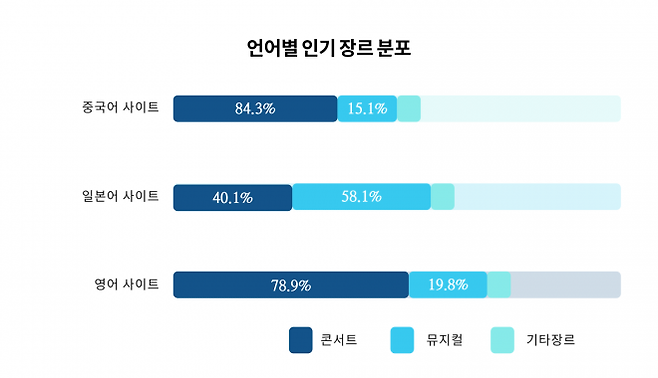 중국어 사이트의 콘서트 장르 티켓팅 금액은 무려 84.3%를 기록했다. 뮤지컬 장르의 티켓팅 금액이 전체의 15.1%만을 차지하고 있다는 것을 감안하면 중국어 사이트를 이용하는 관객들의 선호도가 상당수 콘서트 영역에 집중되어 있다는 것을 알 수 있다. 중국어 사이트의 콘서트 티켓 판매 금액은 2019년에 들어 전년 대비 31% 증가세를 보였다.
