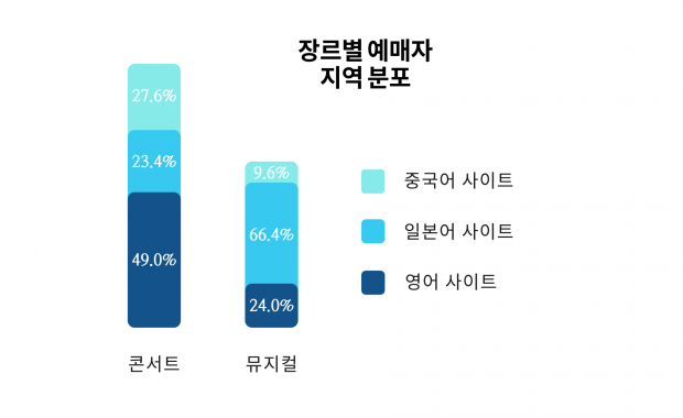 일본어 사이트를 이용한 관객들은 뮤지컬 장르의 티켓팅이 많았는데 영어와 중국어 사이트를 통한 티켓팅은 콘서트 장르가 많았다는 사실 또한 흥미롭다. 영어 사이트를 통한 콘서트 티켓팅의 판매 금액은 2019년에 전년 대비 89%로 크게 증가했다. 방탄소년단(BTS)을 중심으로 한 케이팝(K-POP)의 열풍이 그 성장세에 이바지했다고 보이는 것은 누구든 인정할 수밖에 없는 당연한 이유가 아닐까 한다.