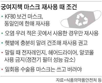 재사용에도 원칙이 있다. KF80, KF94 등 외부 공기 입자를 걸러주는 필터가 달린 보건 마스크는 필요하다면 재사용할 수 있다. 이재갑 한림대 강남성심병원 감염내과 교수는 "바이러스 오염 우려 적은 곳에서 사용했던 경우만 다시 쓸 수 있고, 그 마스크를 썼던 사람만 다시 쓸 수 있다"면서 "가족이라도 써서는 안 된다"고 말했다. 일회용으로 나온 이른바 수술용(덴털) 마스크는 한 번 쓰고 버려야 한다. 수술용 마스크는 상대적으로 구하기 쉽다. 잠재적 감염자로부터 날아오는 침방울을 막는 데는 수술용 마스크로도 충분하다고 감염병 전문가들은 말한다. 본인에게 기침이나 발열 증상이 있을 때 수술용 마스크를 써도 된다.