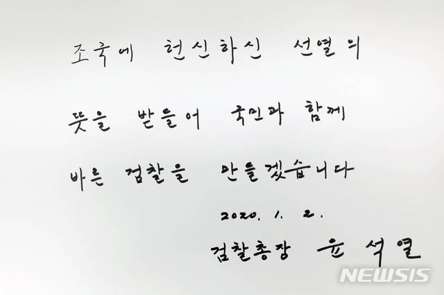 [서울=뉴시스]김병문 기자 = 윤석열 검찰총장이 2일 오전 서울 동작구 국립서울현충원을 찾아 남긴 방명록. 윤석열 총장은 '조국에 헌신하신 선열의 뜻을 받들어 국민과 함께 바른 검찰을 만들겠습니다.'고 방명록을 작성했다. 2020.01.02.