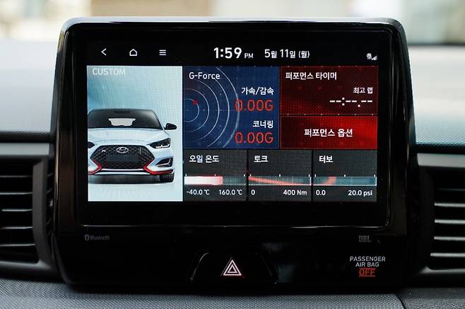 8인치 디스플레이는 UI를 크게 손봤다. 최근 판매되는 현대차 UI를 더하고, 벨로스터 N 전용 화면에 다양한 컬러를 사용했다. 그리고 새롭게 추가된 기능을 다룰 수 있도록 퍼포먼스 옵션이라는 메뉴를 새롭게 만들었다. 빠른 출발을 가능케 하는 론치 컨트롤, 트랙 내 주행 상황에 따라 능동적으로 변속하는 N 트랙 센스 시프트, 변속 충격을 의도적으로 가미한 N 파워 시프트 등 설정이 가능하다.