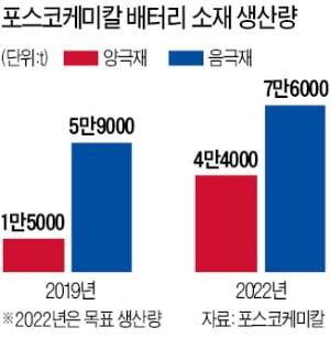 포스코케미칼은 또 다른 2차전지 소재인 음극재 생산량도 단계적으로 확대한다. 충남 세종의 공장을 증설해 생산량을 현재 4만4000t에서 2022년 7만6000t 규모로 늘린다.