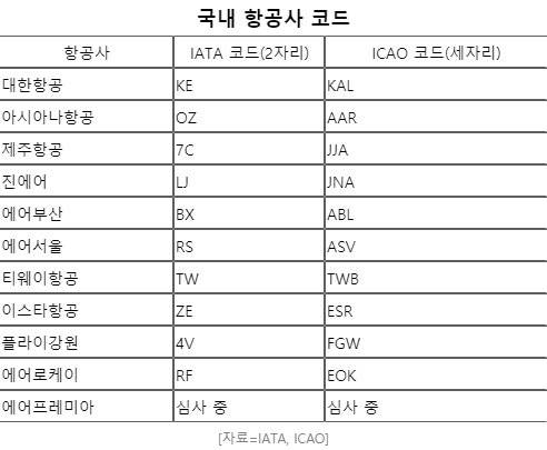 IATA 코드에 비해 늦게 도입된 만큼 항공사들이 원하는 영문명을 받기가 상대적으로 용이한데요. 대한항공은 익히 알려진 'KAL', 아시아나항공은 'AAR', 제주항공은 'JJA'를 쓰고 있습니다.
