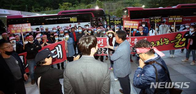 [평창=뉴시스]김경목 기자 = 강원 평창군 봉평면 주민들이 22일 오후 평창군 봉평면 '더화이트호텔' 앞에서 신종 코로나바이러스 감염증(코로나19) 확산 예방을 위한 단기체류 외국인들의 임시생활시설 지정에 반대하는 시위를 하고 있다. 120여명의 주민들은 앞서 세종시 정부세종청사 보건복지부 앞에서 집회를 갖고 더화이트호텔을 격리시설로 지정한 방침을 철회할 것을 요구했다. 2020.05.22.