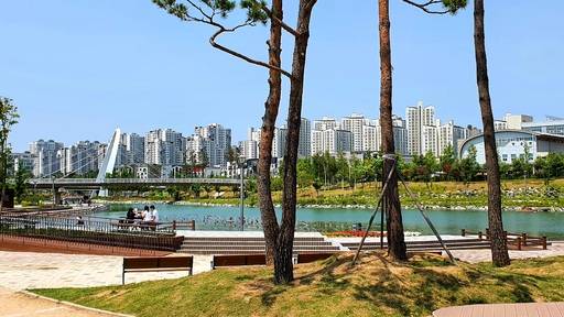 구래역 2, 3번 출구로 나와 두 블록을 지나면 한강신도시 호수공원이다. 주변은 온통 고층 아파트 숲이지만 탁 트인 호수가 한가운데 중심을 잡고 도심의 허파가 돼주니 숨쉬기가 아주 편안하다. 수변테라스, 왕벚나무길, 바닥분수 등으로 아기자기하게 꾸몄고 곳곳에 쉼터가 많다.