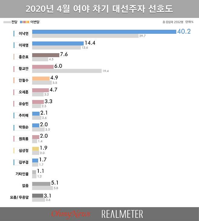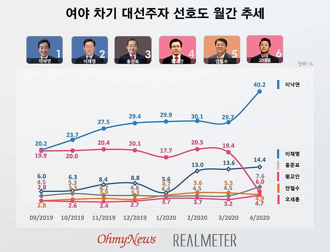 이 전 국무총리가 4.15 총선 직후 진행된 4월 차기 대선주자 선호도 조사에서 지지율이 급상승(▲10.5%p)하며 40%대를 돌파(40.2%)했다. 11개월 연속 1위 수성은 물론 최고치마저 경신하며 독주하는 모양새이다. 이 전 총리는 2위인 이재명 경기도지사(14.4%)와도 더블스코어 이상(25.8%p)의 격차를 보이며 '독보적' 1위를 차지했다.