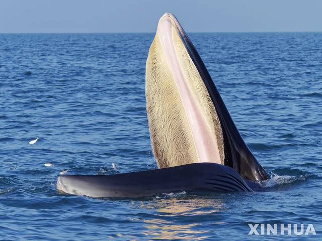 [웨이저우(중국)=신화/뉴시스]지난 8일(현지시간) 중국 광시좡족 자치구 베이부만 웨이저우섬 앞바다에 브라이드고래 한 마리가 수면으로 올라와 입을 벌리고 있다. 2020.01.17.