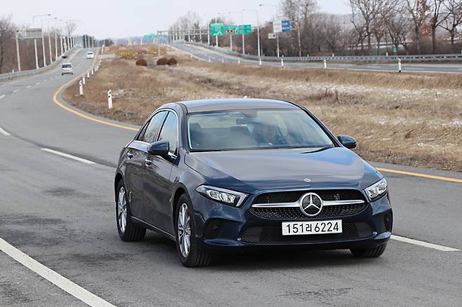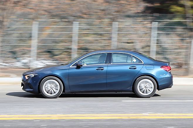 현행 모델은 해치백도 그랬지만 헤어핀이나 급격한 코너링에서 약간은 노즈가 아래쪽으로 쏠리는 느낌이 있다. ESC의 선구자답게 스티어링 휠에 대한 제어는 정확하지만, 상대적으로 원심력이 크다는 느낌이다. 그러면서 타이어도 약간 밀린다. 17인치 미쉐린 타이어는 부드러운 승차 감면에서는 평가할만하지만, 접지력에서는 아쉬운 듯한 것은 세단도 마찬가지이다. 그럼에도 통상적인 주행에서는 해치백과 크게 다르지 않은 거동으로 뒷바퀴 굴림방식 C클래스와 크게 다르다고 느껴지지는 않는다. 물론 다루기 쉬운 특성이라는 점에서는 A클래스가 더 받아들여지기 쉬울 수도 있다.