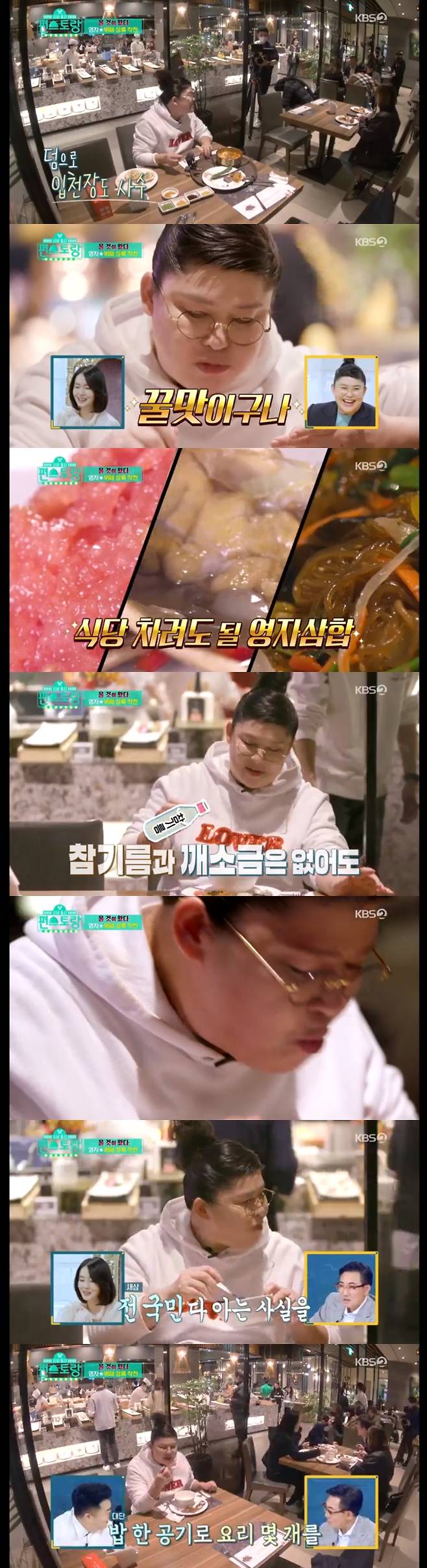 이영자는 "한국 사람은 밥심"이라며 "여기에 참기름 싹 뿌리면 더 맛있을 텐데"라고 말해 판정단의 식욕을 자극했다. (사진= KBS 2TV '편스토랑' 캡처)