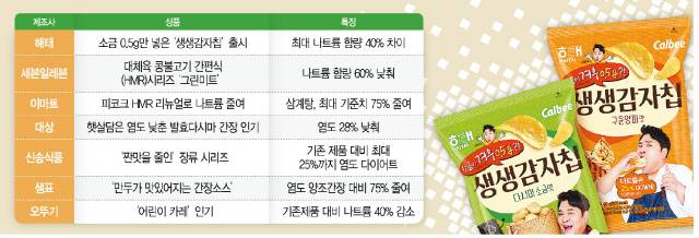 ◇감자칩마저 나트륨 다이어트=최근 가장 눈에 띄는 것은 제과업체 중 처음으로 나트륨 저감 기술을 적용한 해태제과의 신제품 감자칩이다. 특이하게 천연조미료로 불리는 다시마로 짠맛을 대체했다. 해태제과는 3일 소금을 단 0.5g만 넣은 ‘생생감자칩’을 출시했다. 감자칩 시장 2위인 히트상품 허니버터칩을 필두로 생생감자칩으로 감자칩 라인을 강화해 감자칩 시장의 판도를 바꾸겠다는 각오다.