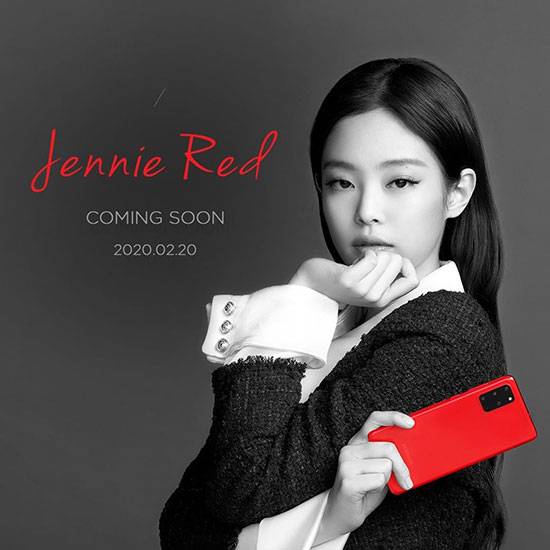 화보 속 제니는 '제니 레드' 컬러의 '갤럭시 S20'과, '갤럭시 버즈+'를 들고 포즈를 취하고 있다.