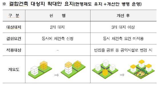 현재 인접대지 간 용적률을 이전할 수 있는 결합건축은 2개 대지간 결합만 인정하고 있으나 앞으로 도시재생사업 등의 활성화를 위해 공공건축물과 결합하거나 빈집을 공원 등 공익시설로 변경하는 경우에는 3개 이상의 대지를 결합할 수 있게 된다.