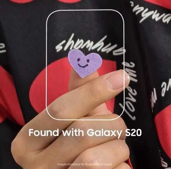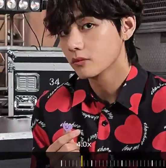 삼성 갤럭시S20 의 스페이스 줌 기능을 이용해 점차 줌을 해보니 뷔의 손가락에는 스마일을 그린 깜찍한 보라색 하트가 숨어있던 것.