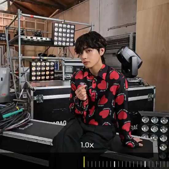 공개된 영상에는 무대 뒤에 걸터 앉아 포즈를 취하는 뷔의 모습이 담겼다.