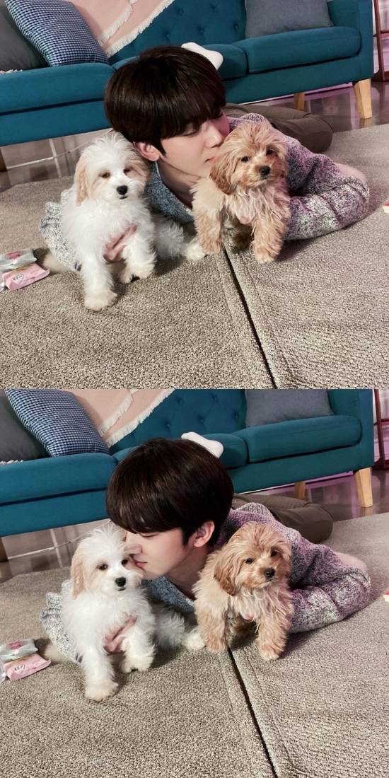 사진 속 김요한은 강아지들과 함께 평화로운 일상을 보내고 있다.