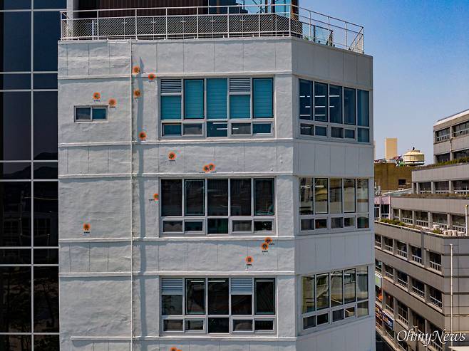 | ▲ 5.18민주화운동 당시 헬기 사격의 탄흔이 남아 있는 전일빌딩의 현재 모습. |
