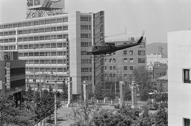 | ▲ 5.18민주화 운동 당시 계엄군의 헬기가 전일빌딩 앞에서 선회하는 모습. 현재 전일빌딩은 당시 헬기사격에서 발생한 탄흔으로 추정되는 자국들이 남아 기록물 형태로 보존하고 있다. |