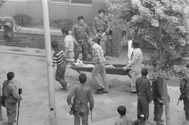 무엇이 그리 급했을까? 신발도 제대로 못 챙긴 듯, 사진 속 미국인은 슬리퍼를 신은 채 황급히 어디론가 이동하고 있었다. 그가 광주시민 4명과 나눠 든 들것에는 윗옷을 입지 않은 이가 정신을 잃은 채 누워 있었다. 계엄군에게 맞은 머리에는 흰 천이 감싸져 있었다.