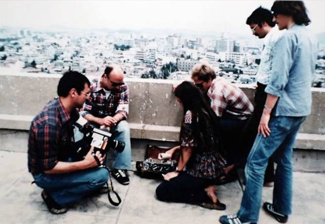 | ▲ 5.18민주화운동 당시, 독일 기자 위르겐 힌츠페터와 평화봉사단 단원들이 인터뷰를 준비하고 있다. 왼쪽에 카메라를 든 인물이 위르겐 힌츠페터이고 오른편 4명(차례대로 쥬디 챔벌린, 팀 원버그, 폴 코트라이트, 데이비드 돌린저)이 평화봉사단 단원들이다. |