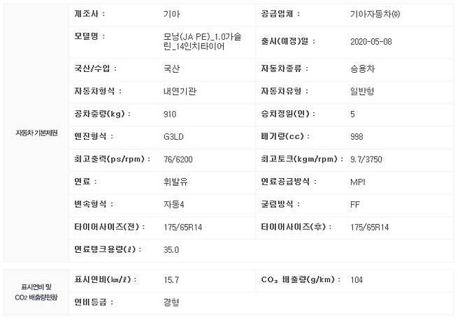 11일 한국에너지공단 표시연비 자료에 따르면 기아차 부분변경 모닝은 1.0ℓ 가솔린 단일 트림으로 출시되며 14인치 타이어 기준 복합 효율이 15.7㎞/ℓ로 나타났다.