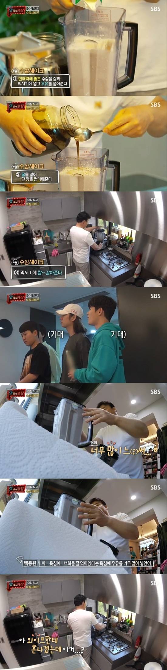 이어 백종원은 수삼셰이크를 만들다가 믹서기가 흘러 넘치자 "너희 잘 먹이려는 욕심에 너무 많이 넣었다. 와이프에게 혼나겠다"고 말했다.