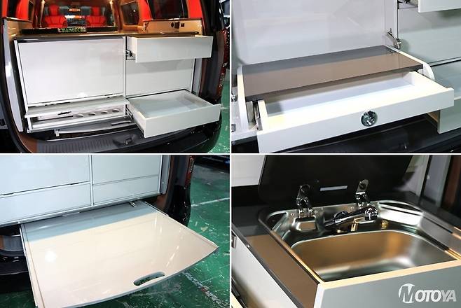 라쿤 팝 S의 자랑인 후방의 슬라이드형 시스템 주방은 하단에 대형의 외부 테이블이 추가되어 있다. 시스템 주방은 수납과 전개에 전동조절기구를채용하여 사용 편의성을 크게 높였다. 또한 가동 범위까지 넓어, 더욱 유연하게 공간을 활용할 수 있다. 시스템 주방은 다양한 크기의 수납함과 냉장고, 싱크보울 및 수전 등으로 구성된다.