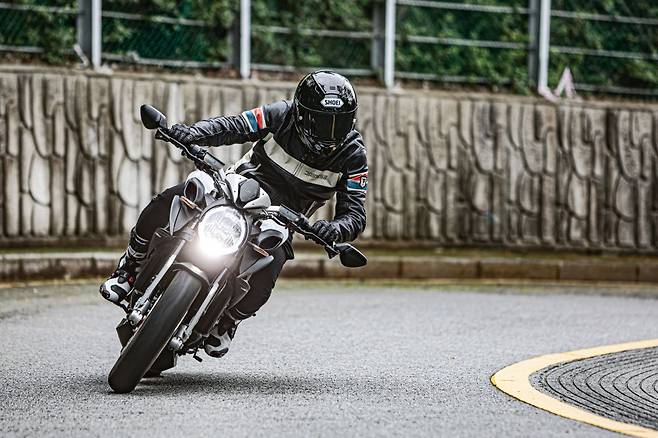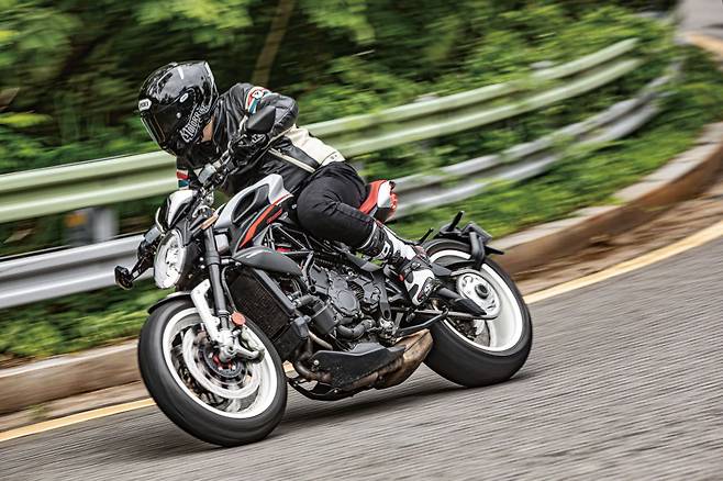 스펙상의 최고출력 140마력, 87Nm의 최대토크는 일단 잊어버려라. 나쁘지도 그리 대단하지도 않은 스펙이지만 이 바이크를 평가하는 데 있어 숫자는 그리 중요하지 않았다. 최고 출력을 내는 결과가 아니라 그 출력을 내는 과정에서 이 바이크의 매력이 드러나기 때문이다. 드랙스터는 정지 상태에서 3초 만에 시속 100km까지 가속한다. 그런데 출력이 나오는 느낌이 꽤나 과격해서 실제보다 더 빠르게 느껴진다. 심지어 가속할 때 트랙션 컨트롤이 8단계 중 5에 맞춰져 있음에도 핸들에 저항이 슥 사라지며 프런트휠이 허공을 가른다. 퀵시프트는 작동감이 빠릿하고 약간의 변속 충격과 함께 팝콘 소리가 터지는 것도 달리는 재미를 준다. 포지션은 자연스러운 네이키드의 자세에서 그립이 살짝 앞으로 당겨지는 공격적인 자세로 변주된다. 시트는 단단하고 몸을 앞뒤로 움직일 수 있는 여유가 적다. 시트포지션은 거의 뒷바퀴 위에 앉아서 타는 느낌이다. 실제로 머리와 엉치뼈를 잇는 라인에 뒷바퀴가 있다. 핸들 바에는 튼실한 배틀가드와 더불어 접이식 바엔드 미러가 장착된다. 스타일은 멋지지만 컴팩트한 차체에 비해 좌우로 상당히 넓어 적당히 공간의 여유를 두고 달려야 한다. 도로 위에서는 이게 그나마 드랙스터 RR의 야수성을 잠재우는 고삐 역할을 하니 오히려 다행이라고 해야 할까?