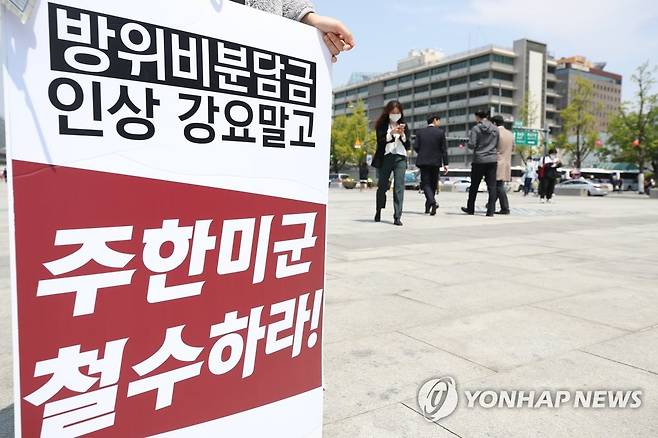 (서울=연합뉴스) 강민지 기자 = 민주주의자주통일대학생협의회(민대협) 소속 학생들이 29일 오후 서울 광화문광장 세종대왕 동상 앞에서 방위비 분담금 인상 반대 주한미군 철수 촉구 피케팅을 하고 있다. 2020.4.29