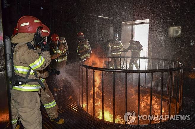 (동해=연합뉴스) 27일 해군 1함대와 동해소방서가 동해 군항 소화 훈련장에 설치된 모의 함정 기관실에서 화재를 진압하는 훈련을 하고 있다. 2020.5.27 [해군 1함대 제공·재판매 및 DB 금지]