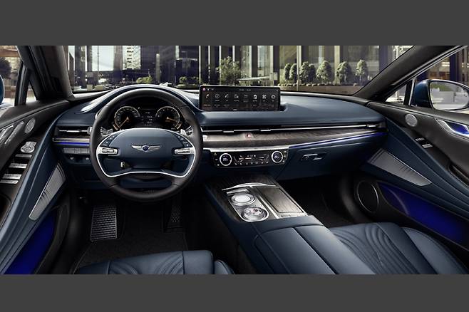 제네시스 통합 컨트롤러와 연동해 편의성을 높인 14.5인치 인포테인먼트 시스템은 ▲증강현실 내비게이션 ▲제네시스 퀵가이드 ▲제네시스 카페이 ▲발레 모드 등을 지원한다.
