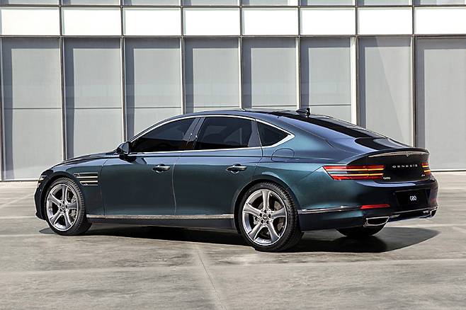 후면부는 쿼드램프와 말굽(Horse shoe) 형태로 둥글게 음각 처리한 트렁크 표면을 통해 신형 G80만의 독창적인 인상을 표현했다. 또한 좌우로 길게 뻗은 트렁크 상단의 크롬 장식과 전동 트렁크 버튼은 제네시스 로고를, 듀얼 머플러는 크레스트 그릴을 각각 떠올리게 하며 제네시스의 정체성을 다시 한 번 각인시킨다.