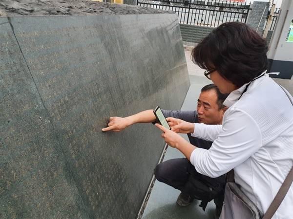 | ▲ 황포군교 입구 비석에서 한국 독립운동가들의 이름을 찾는 답사단원들 |