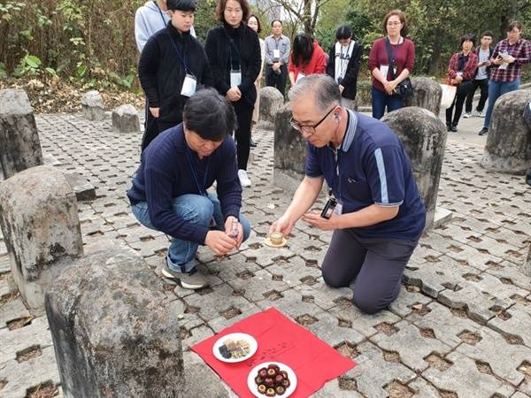 | ▲ 동정진망열사묘원에 잠든 한국인 생도 두 명의 영전에 술을 올리는 청년백범 14기 답사단 |