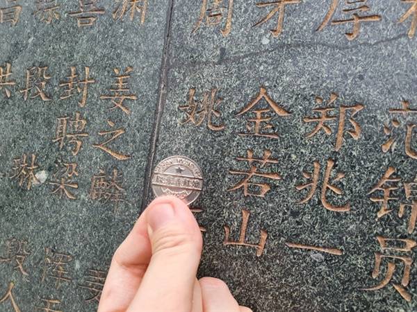 | ▲ 황포군교 입구 비석에 새겨진 '김약산(金若山: 김원봉)'의 이름. 조선의용대 뱃지를 나란히 놓고 인증샷을 찍었다. |