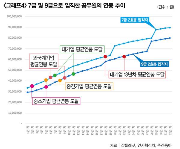 잡플래닛 연봉보고서에 따르면 기업 규모별 평균연봉은 △대기업 4458만 원 △중견기업 3973만 원 △중소기업 3422만 원 △외국계기업 4090만 원이다(표3 참조). 그렇다면 7·9급 공무원은 몇 년을 일해야 민간기업의 평균연봉보다 많은 연봉을 받을까. 9급 2호봉으로 시작하면 5년 차 때 중소기업, 8년 차 때 중견기업, 9년 차 때 외국계기업, 11년 차 때 대기업 평균연봉을 돌파한다. 7급 2호봉으로 시작하면 2년 차, 5년 차, 6년 차, 7년 차 때 중소기업→중견기업→외국계기업→대기업의 평균연봉을 차례로 뛰어넘는다.