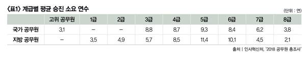 공무원 연봉 산출을 위해 우선 남성이 5급과 7급, 9급의 2호봉으로 입직해 공직 생활을 시작하는 것으로 가정했다(21개월 군 복무를 마치고 별다른 경력 없이 공직 사회에 입문하면 2호봉에 해당한다). 승진 소요 연수는 인사혁신처가 발표한 '2018 공무원 총조사'를 참조해 9급에서 한 직급씩 승진하는 데 3년(8급)→5년(7급)→9년(6급)→10년(5급)→9년(4급)→7년(3급)→5년(2급)→4년(1급)→3년(고위공무원)이 소요된다고 가정했다. 실제 계급별 평균 승진 소요 연수는 '표1'과 같다.