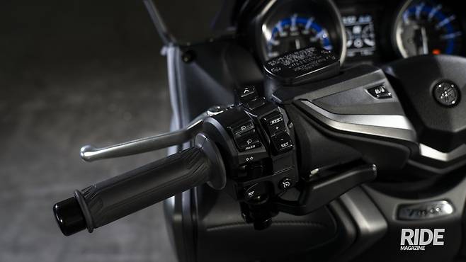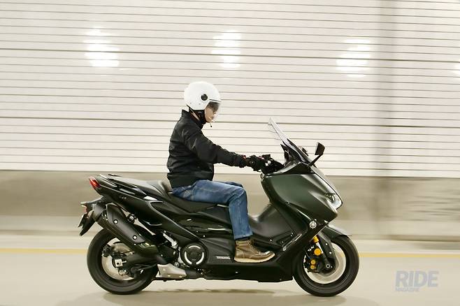 아무래도 이 급의 배기량이 넉넉한 맥시 스쿠터는 대부분 도심에서의 활용도에 추가되어 투어링 목적도 상당히 크기 때문에 상체가 완전히 일어서는 편안한 자세가 연출되기 마련이다. 물론 티맥스는 목적이 꽤 거기에서 벗어나 있다. 투어링도 그냥 투어링이 아니고 스포츠 투어링이다. 그러다보니 핸들바가 꽤 낮은 위치에 있다.